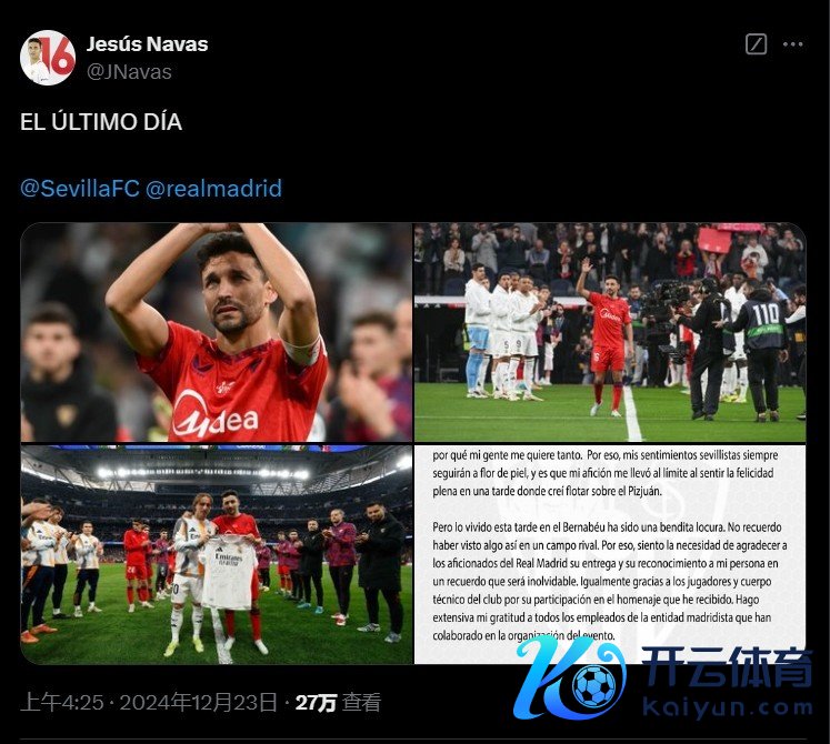 12月23日讯 39岁塞维利亚宿将纳瓦斯将在本轮西甲后退役,球员更新社媒发文致谢皇马对他的致意。