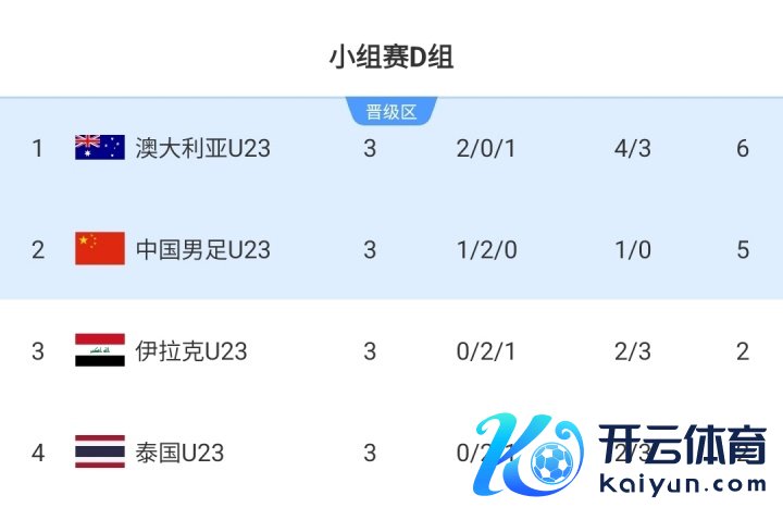 U23国足小组赛战绩:0-0伊拉克、1-0澳大利亚、0-0泰国。1胜2平积5分小组第二出线。
