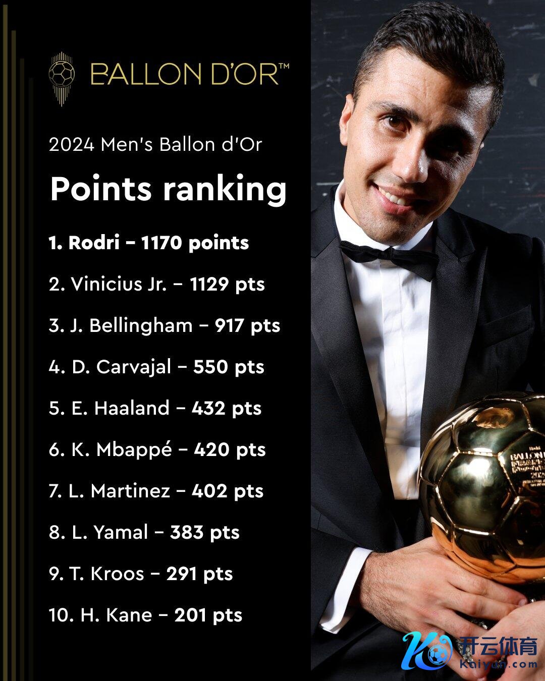 11月09日讯 金球奖公布得分前十,维尼修斯以41分的残障无缘金球奖。