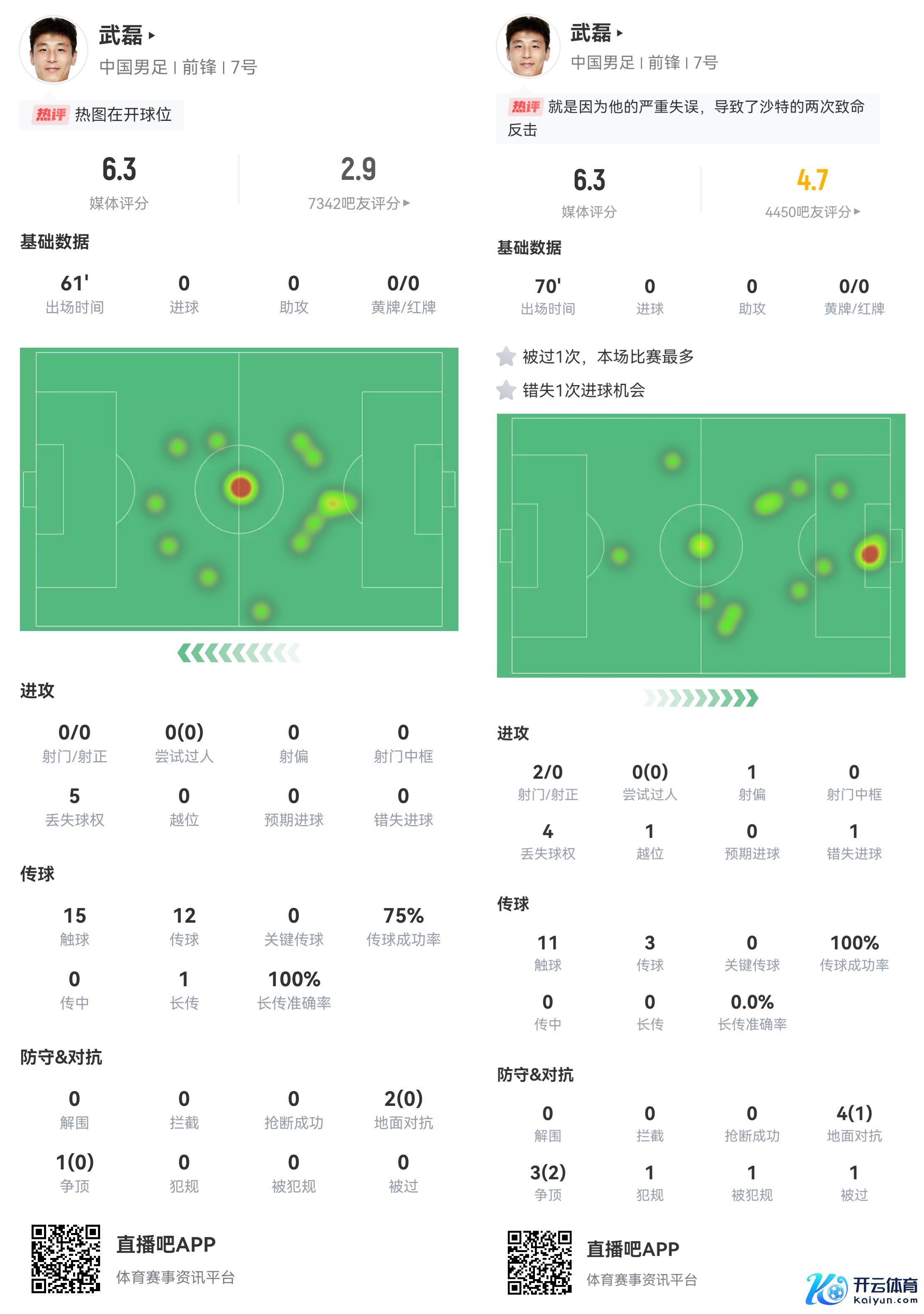而在18强赛赛场,武磊首发出战了国足0-7日本和国足1-2沙特的比赛,因伤缺席了国足1-3澳大利亚和国足2-1印尼的比赛。